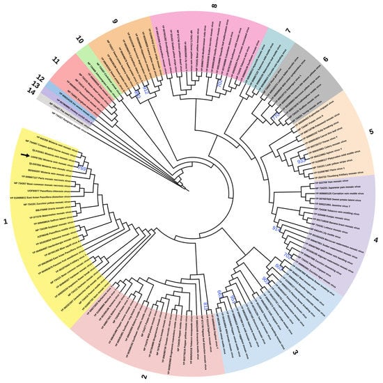 Radial cladogram based on the partial sequence (116 aa) of the nuclear inclusion protein b (NIb) of 147 isolates representative of 143 species members of the genus Potyvirus. Phylogenetic reconstruction, based on the balanced minimum evolution (BalME) criterion [], was performed with FastME/OneClick workflow, available at NGPhylogeny web service, and tree editing was carried out with Interactive Tree of Life (iTOL) software, version 6.5.8. The branch length is unscaled. Bootstrap branch support was computed over 1000 replicates. Bootstrap values higher than 500 are shown above the branches. The tree was rooted using ryegrass mosaic virus (RGMV, genus Rymovirus) as an outgroup. A total of 14 clades were found, based on clustering extending from the most distant node. Distinct clades are numbered from 1 to 14 and highlighted in different colours. The arrow indicates the WVMV isolate Bari, the object of this study. All sequences are identified by their accession number and species name. Detailed information on individual isolates can be found in Table S1.