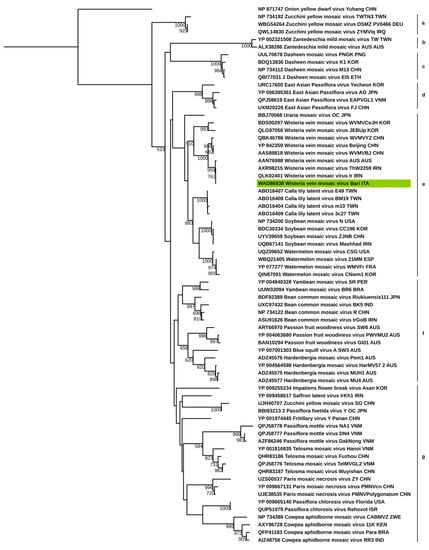 - Al-Jaberi, M.; Mehrvar, M.; Zakiahgl, M. Molecular identification of an isolate of Wisteria vein mosaic virus in Khorasan Razavi province. J. Plant Prot. Mashad 2019, 33, 23–26. [Google Scholar]