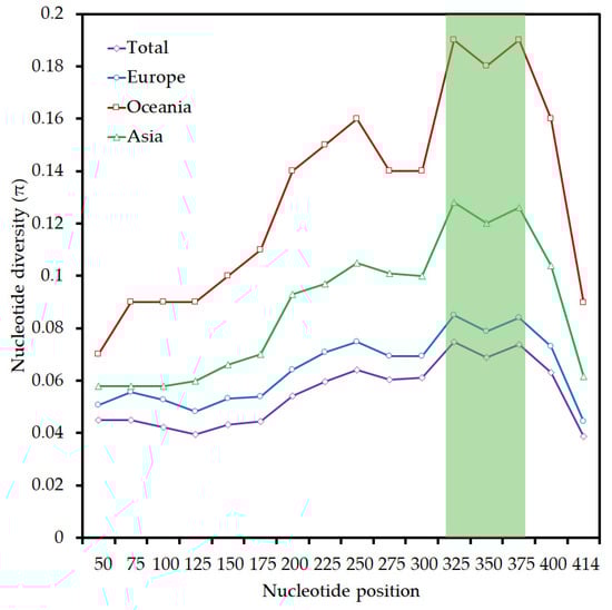 Sliding window analysis, using a step size of 25 bp, showed that in all geographic populations, the highest nucleotide diversity (π) was found in the range between nt positions 325 and 375 (Figure 6). It must be remarked that the measure of diversity observed in Oceania should be weighed against the small number of isolates available (n = 2), even though the two haplotypes presented interesting traits, as also shown by the aforementioned high number of singleton variable sites.