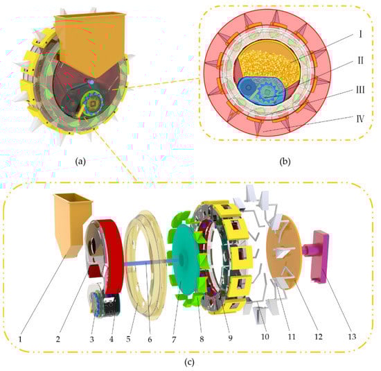 Whole structure of rotary hole filling corn precision metering device. 1. Seed box; 2. casing; 3. ratchet mechanism; 4. seed discharge chamber; 5. seed guide ring; 6. connecting shaft; 7. connecting disk; 8. right-angle seed guide; 9. stagnant seed chamber; 10. rocker; 11. duckbill device; 12. outer disk; 13. fork. (a) axonometric drawing of seed rower; (b) side view of seed rower; (c) exploded view of seed rower; I. filling area; II. seed replanting area; III. seed guide area; IV. seeding area.