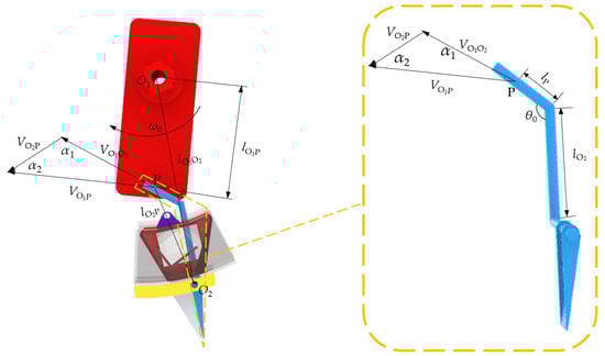 where is the absolute velocity of rocker at the fork cam midpoint, P, in m/s; is rotation speed of the cam midpoint, P, with respect to O2, in m/s; is the traction speed of the fork and rocker, in m/s.