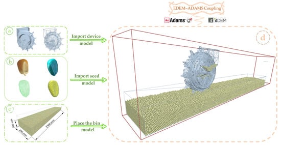 EDEM–ADAMS coupled virtual seeding process. (a) seed rower model; (b) corn seed model; (c) soil particle and trough model; (d) coupling simulation process.