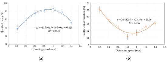 Trend of operating speed on each performance test index. (a) Effect of operating speed on qualified index; (b) effect of operating speed on coefficient of variation.