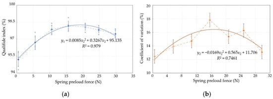 Trend of spring preload force on each performance test index. (a) Effect of spring preload force on qualified index; (b) effect of spring preload force on coefficient of variation.