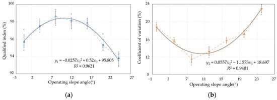 Effect of operating slope angle on the trend of each performance test index (a); the effect of operating slope angle on the qualified index; (b) effect of operating slope angle on the coefficient of variation.