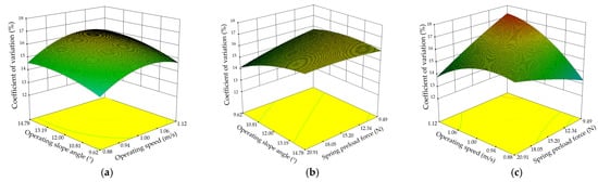 Surface response of each factor to the coefficient of variation. (a) Operating speed and operating slope angle; (b) operating slope angle and spring preload force; (c) operating speed and spring preload force.