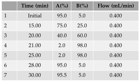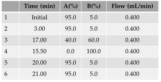 For limonoids determination was followed the method described by Celano et al. [32], using a UHPLC-DAD system equipped with a Kinetex 2.6 μm Biphenyl 100 Å. The chromatographic conditions are shown in Figure 3, in which the mobile phase consisted of water (A) and acetonitrile (B).