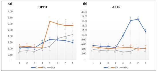 Results of total antioxidant activity ((a), DPPH; (b), ABTS) of different BP extracts (mM TE g−1 dw). Small letters show significant differences as assessed by Tukey’s post hoc test.