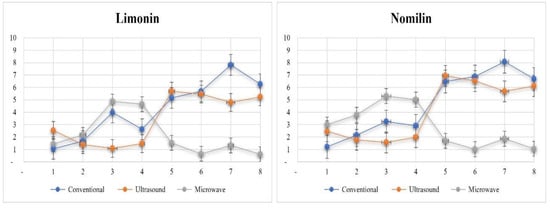 Additionally, the limonoid content was evaluated on Bergamot pomace extract, as it represents an interesting index to evaluate, indeed, its contribution to the bitter taste of citrus fruits, as also reported by Shi et al. [40]. In addition, limonoids from Citrus are getting a lot of scientific interest for their bioactive properties in vitro and in vivo such as antitumor, antioxidative, and antibacterial compounds [41]. The chromatographic analysis showed that also the highest yield of the two mains determined limonoids (limonin and nomilin) was obtained through conventional extraction technique C7 (Figure 6).