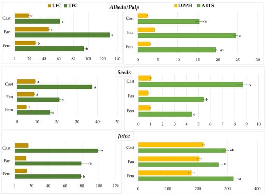 Total antioxidant activity of the different bergamot portions (Albedo/pulp and seeds: TFC: mg CE g−1 dw, TPC: mg GAE g−1 dw; ABTS and DPPH: mM TE g−1 dw; Juice: TFC: mg CE 100 mL−1, TPC: mg 100 mL−1, ABTS and DPPH: mM TE L−1). Small letters show significant differences as assessed by Tukey’s post hoc test.