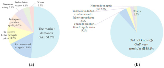 Surveyed farmers’ motivations (and the lack thereof) in applying for Q-GAP. (a) Certified farmers’ motives for having applied (N = 100, C = 120); and (b) uncertified farmers’ reasons for not having applied (N = 229, C = 232). N indicates the total number of farm samples, and C indicates the total number of counts. Note: The certified farmers are accounted for the reasons why they applied for Q-GAP, and the uncertified farmers for the reasons why they did not apply for it.