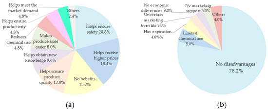 Certified farmers’ views about the benefits and disadvantages of Q-GAP certification. (a) Benefits from Q-GAP certification (N = 100, C = 125); and (b) disadvantages of Q-GAP certification (N = 100, C = 101). N indicates the total number of farm samples, and C indicates the total number of counts.