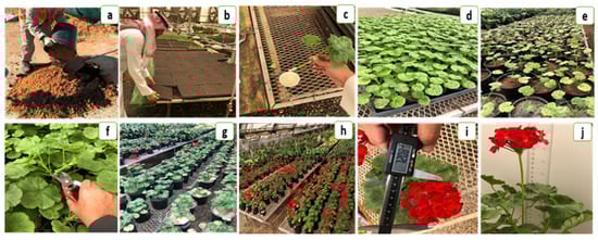 Experimental layout; (a) preparing soil mixture for cutting rooting; (b) preparing seedling tray for cutting rooting; (c) cutting bases dipped in indole-3- butyric acid (IBA) for indicating rooting formation; (d) cultivation of IBA treated cutting in seedling trays; (e) 30-day rooted cuttings were transplanted in 25 cm plastic pots (one plants/pot); (f) pinching plant shoot for improving branching capacity; (g) vegetative growth of Pelargonium peltatum; (h) flowering characteristics of plants; (i) estimation of inflorescence diameter; (j) estimation of plant height.