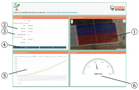 In addition to the REST API, a web service has also been developed for obtaining and visualizing the GDD from any device, as shown in Figure 3. To use the web service, the user must start by selecting his/her field from map panel ① and then set the start and end dates noted with ②. In the example of Figure 3, which focuses on the Malagouzia vineyard of Gerovassiliou Estate in 2021, the start date is set to the date of budburst (7 April 2021) and the end date is set to a date after veraison (31 July 2021), while the base temperature is set to 10 °C (shown with ③ in Figure 3). To display the result, the user has to click the “GDDs” button noted with ④, and the GDD result will be presented by means of a cumulative plot (⑤ in Figure 3) and a counter showing the resultant GDD on the end date (⑥ in Figure 3).