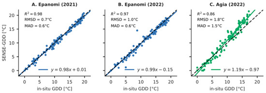 Scatterplots of daily GDD calculated from SENSE-GDD versus in situ daily GDD and corresponding linear fit equations and performances for Gerovassiliou Estate vineyard at Epanomi spanning (A) April–July 2021 and (B) April–July 2022; and (C) apple orchard at Agia spanning mid-June to July 2022.