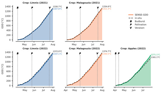 The cumulative GDD and the date of key phenological stages of the three crop types are also used for assessing the performance of SENSE-GDD. Budburst, pollination, and the start of veraison are selected as key phenological stages for the two wine grape types in Epanomi (Malagouzia and Limnio) and budburst and pollination for the Granny Smith apple orchard in Agia. Observations in vineyards were performed in situ by the winery agronomists to determine the calendar date that each key stage started in the 2021 and 2022 cultivation periods. A network of field-installed cameras was used to monitor the apple trees canopy development in 2022 and the photos were used to determine the budburst and flowering stages. The analysis of the camera photos showed that the buds of the Granny Smith apple trees burst on 4 March 2022, while tree flowering phase began just 10 calendar days later, on 13 April. To assess the SENSE-GDD’s capability to provide the phenological stages based on GDDs as closely as possible to a weather station, we first calculated the cumulative GDDs (Equation (3)) from the in situ data, using as start date the observed budburst date and as end date the flowering or veraison (only for vineyards) dates. Then, we compared the in situ cumulative GDD calculated for each phenological stage against the corresponding data retrieved from SENSE-GDD, in order to identify on which calendar date the SENSE-GDD and the in situ estimates are approximately equal: