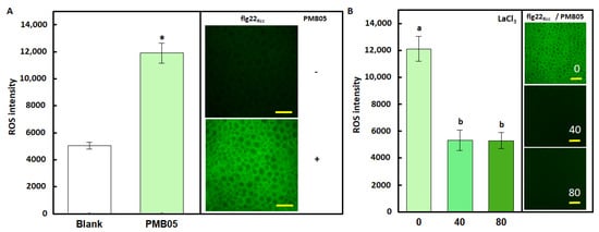 Effect of LaCl3 on ROS generation intensified by Bacillus amyloliquefaciens PMB05 upon activation with flg22Xcc. Panel (A) indicates the flg22Xcc-induced ROS generation was intensified by B. amyloliquefaciens PMB05 on cabbage leaves. The symbols “+” and “−” indicate the application of distinct treatments for inclusion and exclusion of PMB05. The * above the columns indicates a significant difference compared to the blank treatment based on a t test (p < 0.05). Panel (B) indicates the B. amyloliquefaciens PMB05-intensified ROS generation was reduced by different concentrations of LaCl3 (0, 40, 80 μM). Bar indicates 20 μm in length. Different letters (a, b) on the columns indicate significant differences between treatments based on Tukey’s HSD (F = 21.993; p < 0.05).