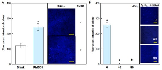 To ascertain whether calcium influx is required for B. amyloliquefaciens PMB05 in the intensification of plant immune responses in cabbage, the calcium channel blocker, LaCl3, was applied to assay its effects on rapid ROS generation and callose deposition. The results showed that the flg22Xcc-induced ROS generation was strongly intensified by the presence of PMB05 in cabbage leaves (Figure 1A). In the assay with the subsequent addition of LaCl3, ROS generation was significantly reduced. However, there were no significant differences between the two concentrations tested (Figure 1B). For callose deposition, the flg22Xcc-induced callose signal was intensified by PMB05. More significantly, in subsequent assays with the addition of LaCl3, both concentrations completely eliminated callose deposition in the presence of PMB05 (Figure 2).