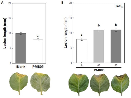 Effect of LaCl3 on black rot disease controlled by Bacillus amyloliquefaciens PMB05. Panel (A) indicates the lesion length reduced by the treatment with bacterial suspension of B. anyloliquefaciens PMB05. The * above the columns indicates a significant difference compared to the blank treatment based on a t test (p < 0.05). Panel (B) indicates the effect of LaCl3 on bacterial suspension of B. anyloliquefaciens PMB05 in reducing lesion length of black rot disease. The seedlings were prepared from clean seeds as test materials. Before inoculation, the mixture of bacterial suspensions of B. amyloliquefaciens PMB05 and Xanthomonas campestris pv. campestris XCC15 was prepared by mixing them with equal volume. Then, the LaCl3 was applied to make the final concentrations at 40 mM and 80 mM. The inoculation was carried out by cutting the leaves at 0.5 cm from the edge of the leaf with a scissor dipping in the mixture. Data were collected at 7 days post-inoculation. Different letters (a, b) on the columns indicated significant differences between treatment based on Tukey’s HSD test (F = 16.571; p < 0.05).