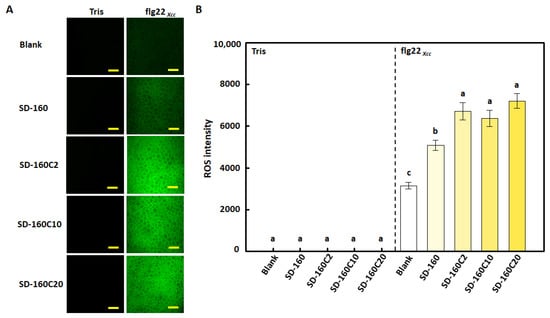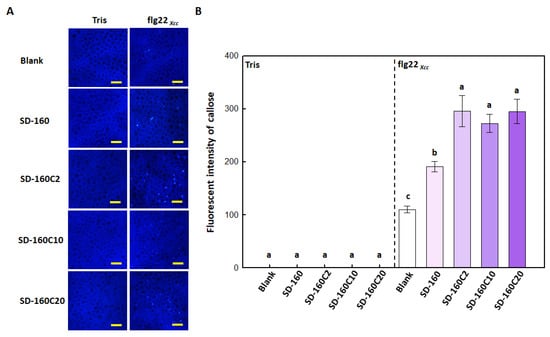To evaluate the difference in the effects of intensifying plant immune signals on seedlings grown from seeds treated with different PMB05 powders, flg22Xcc-induced rapid ROS and callose deposition on seedlings were analyzed. The results showed that both flg22Xcc-induced ROS generation and callose deposition were intensified in the seed treatment with SD-160 (without calcium carbonate addition) in cabbage leaves. The above immune responses were further intensified in the seedlings from seed treatments with SD-160C2, SD-160C10 and SD-160C20. However, powders with more calcium carbonate in the formulation did not further intensify the plant immune signals (Figure 4 and Figure 5).