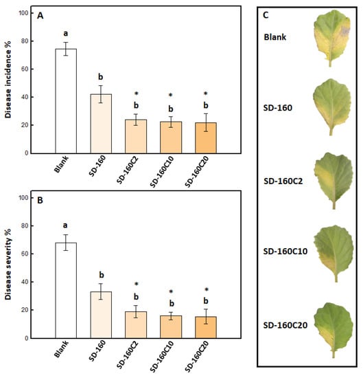 Effect of Bacillus amyloliquefaciens PMB05 in seedling grown from different powder treatments on the control of black rot disease. This experiment was conducted with 1% of PMB05-powders on Xcc-contaminated seeds. Panel (A,B) indicate the disease incidence and disease severity at 4 weeks after sowing, respectively. Different letters (a, b) above the columns indicate significant differences between treatments based on Tukey’s HSD test (for disease incidence, F = 19.951; for disease severity, F = 22.872; p < 0.05). The * indicate a significant difference compared with the blank treatment, as assessed using a t-test (p < 0.05). Panel (C) exhibits the development of symptoms.