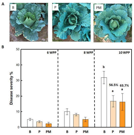Effect of PMB05-powder on the control of cabbage black rot disease in the field. This experiment was conducted in a field in Neipu, Pingtung County in 2022. Panel (A) shows the symptom appearance of black rot disease at 6-week-post-planting (WPP). Panel (B) shows the disease severity of black rot disease at 6-, 8-, and 10-WPP. The powder treatment (P) was carried out with clean seeds mixed 1% of PMB05 powder (SD160-C2) before sowing for seedlings preparation. After the seedlings were planted in the field, bacterial suspensions of Xanthomonas campestris pv. campestris XCC15 were sprayed every two weeks to allow disease to occur. The results were collected at 6-, 8-, and 10-WPP. B indicates the untreated treatment, and PM indicates the powder treatment with additional spray of 500-fold dilution of Meili Calcium every two weeks. The numbers on the columns indicated the control efficacy. Different letters (a, b) above the columns indicate significant differences between treatments based on Tukey’s HSD test (F = 12.543; p < 0.05).