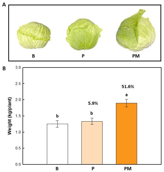Effect of PMB05-powder on appearance and weight of harvested cabbage in the field trial. Panel (A) shows the harvested cabbage at 10-week-post-planting (WPP). Panel (B) shows the cabbage yield was assessed by weighing the cabbage after cutting it from the base. B indicates the untreated treatment, P indicates the powder treatment, and PM indicates the powder treatment with additional spray of 500-fold dilution of Meili Calcium every two weeks. In these assays, six plants in one field plot were regarded as one repeat, and five plots were repeated in each treatment. Different letters (a, b) above the columns indicate significant differences between treatments based on Tukey’s HSD test (F = 12.776; p < 0.05).