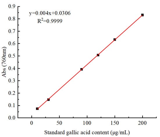 The TP content of the apples was determined by the Folin–Ciocalteu method, with small modifications [21]. The apple slices (m) were ground into pulp and then 1 g of the pulp was mixed with 5 mL of hydrochloric acid/methanol solution (1% v/v) and left to stand for 20 min at room temperature away from light, then the supernatant was taken by centrifugation (4500 r·min−1, 10 min), which was the total phenolic extract (V). After dilution with ultra-pure water at 1:9 (v:v), 1 mL of Folin-phenol reagent was placed in a 10 mL centrifuge tube, 1 mL (V0) of the total phenol extract obtained as above was added and mixed, then 2 mL of 75 mg·mL−1 Na2CO3 solution was added and the reaction was carried out at room temperature for 30 min away from light. Finally, the absorbance of the aforesaid solution was observed and recorded at 760 nm, with methanol serving as a blank control. The TP content was calculated as milligrams of gallic acid per gram of sample (ug·g−1). The gallic acid standard curve is shown in Figure 1. The calculation formula was as follows: