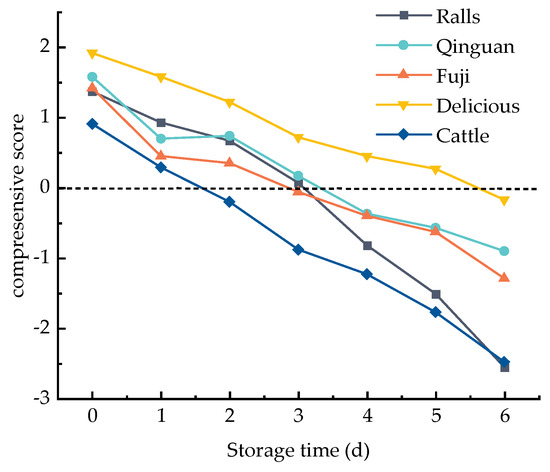 Firmness mirrors the level of maturing and aging of the apple. The pectin material in apples is decomposed to form pectin and pectin acid, which makes the apples soften, and the hardness decreases [25]. According to Figure 2, there were differences in the initial firmness of different varieties of apples. The firmness of the Cattle apples decreased by 2.76, while the firmness of the Qinguan apples and Delicious apples decreased by only 1.10 and 0.92, respectively, which is significantly better than the Ralls, Fuji, and Cattle apples.
