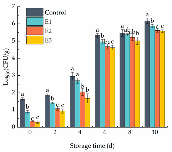 Figure 6 shows the changes during storage in the aerobic bacteria in fresh-cut Delicious apples under PEF treatment and in the control. The total number of colonies expanded gradually during storage. In the beginning, the microbial populations of the PEF-treated samples differed significantly from the control samples. E2 and E3 were 1.26 and 1.33 lower than the control samples, respectively. After 4th day, the gap between PEF and the control began to diminish, but the E3 group was constantly weaker than the control. However, on the 4th and 8th days, the difference between the E1 group and the control was not statistically significant. The microbial population of the control was higher than 6 log10 CFU/g on the 10th day; this was considered quite high and was not recommended for consumption [37,38,39]. The results proved that PEF treatment could depress the total bacteria count and inhibit the growth and multiplication of aerobic bacteria, and the high electric field intensity treatment was more effective. The effect of PEF on microorganisms was mainly to cause irreversible electroporation of the cell membrane of the bacteria, leading to cell death. Therefore, high-intensity electric field stimulation causes more damage to bacteria.