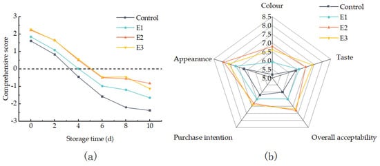 The composite score is shown in Figure 7a. It can be seen that the scores of E2 and E3 treatments were always higher than those of E1 and the control. On the 10th day, the score of E2 was higher than E3, and there was no significant difference between E2 and E3 at other t times. The results showed that the apples treated with 3 kV/cm and 5 kV/cm had the best overall quality and storage resistance after fresh cutting. Figure 7b clearly demonstrates that PEF treatment was successful in improving the appearance, color, taste and acceptability of fresh-cut apples, and also improved consumers’ purchase intention. Among the PEF treatments, E2 treatment had the best effect on the color, appearance, and overall acceptability, and E3 treatment had the best effect on the taste and purchase intention. These findings also demonstrate the potential for practical production using PEF technology.