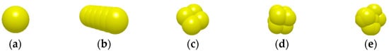 Due to the irregular and random shape of soil particles, five discrete soil particle models with different shapes were established using the clustered particle approach [26], as shown in Figure 2. The primary diameter of the sphere element was 10 mm, and the size ratio varied randomly from 50 to 150%.