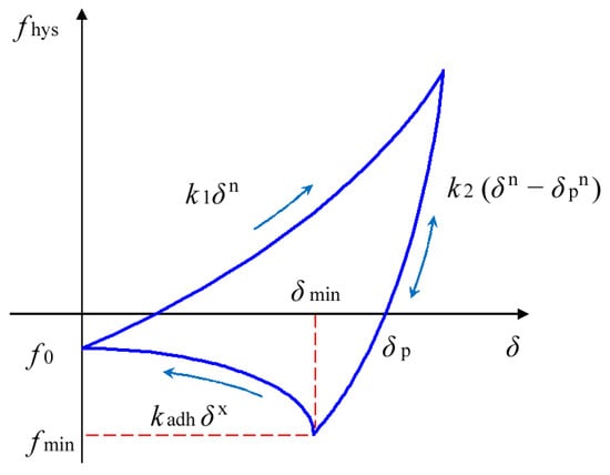 where f0 is the constant adhesion force, δ is the normal overlap, k1 and k2 are the initial loading stiffness and the unloading/reloading stiffness, n is the corresponding power value, kadh is the adhesive stiffness (kadh = fmin/δminx), x is the corresponding power value, and vnrel is the normal relative velocity. Due to plastic deformation δp, k2 is larger than k1. The normal damping coefficient , where m∗ is the equivalent mass of the contact particles, e is the coefficient of restitution.