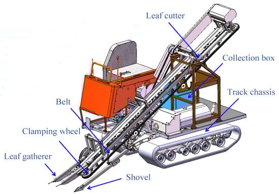 The structure and operation parameters of the harvesting device were designed, as shown in Figure 4. The harvesting device was mounted on a differential drive track chassis. Two leaf gatherers were installed at the front of the frame. Two belts were installed on two rows of parallel clamping wheels. The clamping force can be adjusted by a set of compression springs. A rotary leaf cutter was mounted at the rear of the frame. A removable shovel was mounted under the frame.