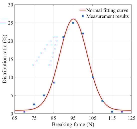 The tensile strength of radish leaves is a key mechanical property that determines whether the radish can be pulled out effectively. Here, the digital force gauge was used to measure the leaf breaking force in the field. The resolution and the measurement error are 1 g and 1.0%. The statistical measurement results are shown in Figure 5. Due to the individual differences of radishes, the breaking force of leaves is distributed in a certain range. When the pulling speed was 0.1 to 0.4 m/s, the breaking force of the leaves was basically normally distributed. The minimum and maximum values were about 66.4 and 123.3 N, respectively. Therefore, one prerequisite for effective radish pulling is that the pulling force should be less than 65 N, or else the leaves may be broken, and the fruit will be lost in the field.