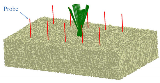 The planting environment of white radish is diverse, and the compactness of the soil bed is different. Soil compactness is a major factor affecting the pulling dynamic process. Therefore, an important preparatory work for the DEM simulation of radish pulling dynamics is the establishment of the soil bed. In the DEM simulations, the initially generated soil particles are loose. To obtain soil beds with different compactness, a rigid plane was used to suppress soil particles after the initial generation of the soil bed. Different soil compactness can be obtained by changing the compaction depth. When the soil bed compaction operation was completed, ten uniformly arranged measuring probes were vertically penetrated into the soil bed, as shown in Figure 6. The diameter of the probe model was 12 mm. The probe penetrated the soil bed at a uniform speed of 50 mm/s, and the maximum penetration depth was 100 mm. The probe structure and compactness measurement method were the same as those of the TJSD-750 Soil Compaction Meter.