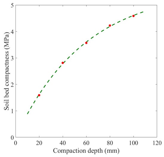 With the compaction depth h in the range of 10–100 mm, the variation of SC is shown in Figure 8. The relationship between h and SC can be fitted using an exponential function with the form