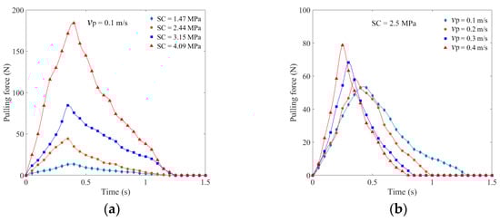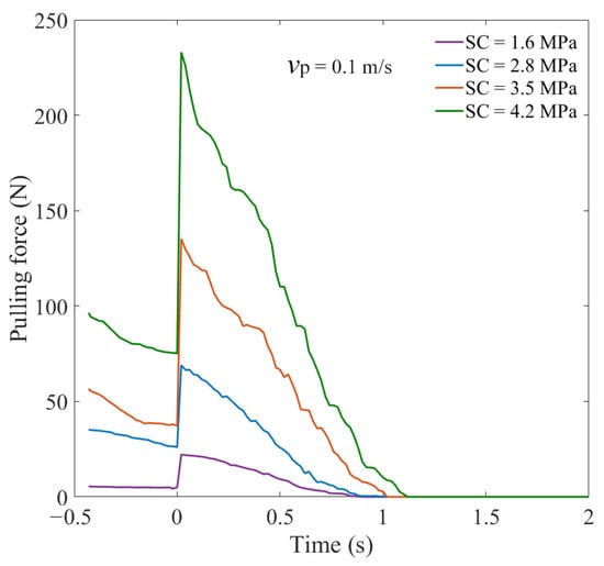 As shown in Figure 9, the maximum pulling force Fp max increases rapidly with the increase of SC. With the vertical pulling speed vp of 0.1 m/s, Figure 10 shows the relationship between the maximum pulling force Fp max and SC, which can be fitted using an exponential function with the form