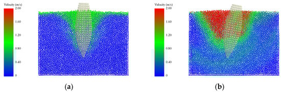 Disturbance of soil particles at the moment of radish pulling up: (a) θ = 0°; (b) θ = 10°.
