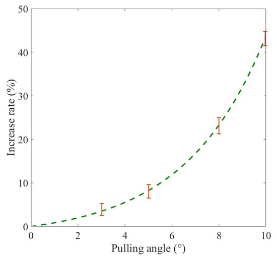 The pulling force is mainly generated by the disturbance of the radish fruit to the soil bed. This disturbance is not only dependent on the pulling speed and soil compactness but is also closely related to the pulling angle. When the pulling speed vp is 0.1 m/s and the pulling angle θ is 0 and 10°, Figure 12 gives the velocity change of the soil particles around the radish fruit when the pulling force reaches the maximum value. Obviously, when the radish is pulled vertically, the disturbance to the surrounding soil particles is minimal. With the increase of θ, the disturbance region and the velocity of soil particles will increase, and the corresponding pulling force will also increase. When vp increases from 0.1 to 0.5 m/s, Figure 13 gives the variation of increase rate of the maximum pulling force γθ.