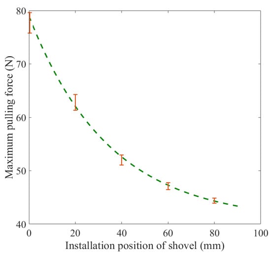 The loosening shovel reduces the pulling force by breaking the particle structure of the soil bed. Therefore, the coordination between the loosening time to the soil bed and the time to start to pull the radish is important, which is mainly determined by the relative position of the loosening shovel to the clamping wheels. As shown in Figure 14, the horizontal displacement between the shovel tip and the wheel center is defined as the installation position L. Figure 15 gives the variation of the maximum pulling force Fp max with the installation position L, with the forward speed of 0.2–0.4 m/s and the soil compactness of 3.0–4.0 MPa. Due to the disturbance of the loosening shovel to the soil bed, the bonding force between the soil particles and the radish is effectively broken, and the Fp max is rapidly reduced. As the installation position L moves forward, the loosening time to the soil bed increases, and the Fp max decreases more significantly. On the other hand, during the soil bed loosening process, the radish is subjected to an additional force in the forward direction. This force will increase with the increase of the installation position L and will affect the posture of the radish and the stability of the leaf gathering. So, a suitable installation position L should be in the range of 50–70 mm, and the maximum pulling force Fp max can be effectively reduced to less than 65 N.
