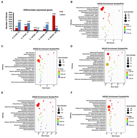 Differentially expressed genes and scatterplot of top 20 enriched KEGG pathways for DEGs in each pairwise comparison: (A) The number of differentially upregulated (red) and downregulated (blue) genes between control and drought stress conditions. (B) D_FL vs. C_FL. (C) D_7P vs. C_7P. (D) D_14S vs. C_14S. (E) D_25S vs. C_25S. (F) D_35S vs. C_35S. The enrichment factor is the ratio of the number of DEGs annotated with pathway entries to the number of genes annotated with all pathway entries.
