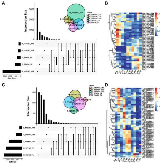 Venn diagrams were constructed to show the overlapping sets of all upregulated and downregulated DEGs between the groups (Figure 2A,C). The results displayed 41 overlapping upregulated (0.35% of all DEGs) and 51 overlapping downregulated DEGs (0.44% of all DEGs) across any three of all stages, respectively. No DEG was shared by all five comparisons, which indicates that the five tissues or stages have different mechanisms to resist drought stress. We constructed heat maps to show the expression patterns of these common DEGs, and they showed varied patterns (Figure 2B,D). Among the common DEGs, 66 genes have functional descriptions and 14 of them are known drought resistance genes, including DREB 2D [27], HSFA-2 [28], probable E3 ubiquitin-protein ligase XERICO [29], delta-1-pyrroline-5-carboxylate synthase [30], LEA5 [31], etc. (Table S5).