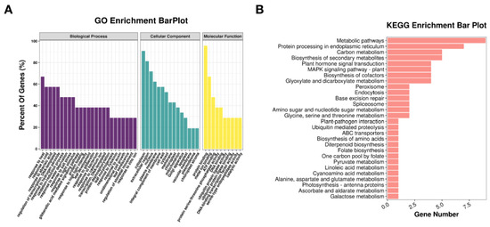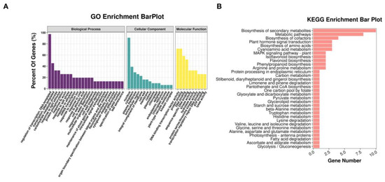 GO enrichment revealed that these DEGs were involved in several biological processes, including ‘regulation of transcription, D-templated’, ‘transcription, D-templated’, carbohydrate metabolic process, response to light stimulus, protein phosphorylation, etc. (Figure 3A). The main enriched cellular components were the nucleus, cytoplasm, plasma membrane and extracellular region components. The most common molecular functions were DNA binding transcription factor activity, protein binding, DNA binding and sequence-specific DNA binding. This indicates that these DEGs are upstream regulators of some biological processes. The enrichment of the KEGG pathways indicated that these DEGs were mainly involved in secondary metabolite biosynthesis, metabolic pathways, cofactor biosynthesis, plant hormone signaling, cyanoamino acid metabolism and the MAPK signaling pathway in plants (Figure 3B).