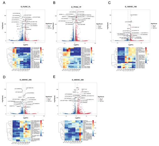 Analysis of the volcano plot top 20 drought-responsive genes at different stages of soybean seed development: (A–E) Volcano plot labeled with the top 20 DEGs at different stages of soybean seed development, upregulated genes (red) and downregulated genes (blue). Under is the heatmap of the top 20 genes. Heatmap showing the expression pattern of selected DEGs. Gene expression data were normalized to Log2 (FPKM + 1); red and blue represent upregulated and downregulated genes, respectively.