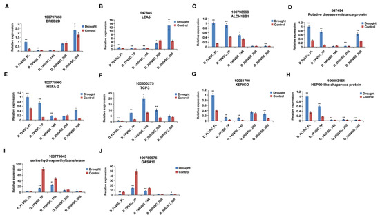 The relative expression of DEGs was determined by qRT-PCR at five seed developmental stages after drought stress: (A–J) Expression of 10 differentially expressed genes in response to drought stress treatment. Bars mean SD. * p < 0.05; ** p < 0.01.