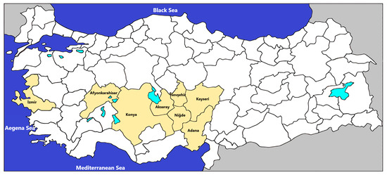 The main material of the study consisted of the data obtained by the survey method from farmers. The research was carried out in eight provinces (Adana, Afyonkarahisar, Aksaray, İzmir, Kayseri, Konya, Nevşehir, and Niğde) where the potato cultivation areas are large in Turkey (Figure 1). Secondary data related to the study were obtained from The Food and Agriculture Organization (FAO), the Turkish Statistical Institute (TSI), and the Provincial Directorates of the Ministry of Agriculture and Forestry. Additionally, national and international studies on the subject were also utilized.