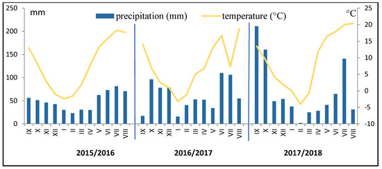 During the winter wheat growth period (from October to July), the average air temperature was in the 2015/2016 period +6.3 °C; in the 2016/2017 period + 6.5 °C; and in the 2017/2018 period it was +7.7 °C (Figure 1). Precipitation during this period was: season of 2015/2016—470.0 mm; 2016/2017—663.7 mm; and 2017/2018—602.2 mm. The highest amount of precipitation was noted: in the season of 2015/2016 in July (17.3% of the total amount); in 2016/2017 in June and July (32.5% of the total amount); and in 2017/2018 in October and June (26.6 and 23.4%, respectively). The following factors were not conducive to wheat growth: in the 2015/2016 period—very high precipitation in July (the ripening stage); in the 2016/2017 period—a very low rainfall in May (during this period, the wheat was at the stem elongation stage), and a very high rainfall in July (the ripening stage); and in the 2017/2018 period—a very wet October (which prevented the sowing of wheat and delayed it significantly). In all years of the study, the air temperature was sufficient for the growth of wheat.