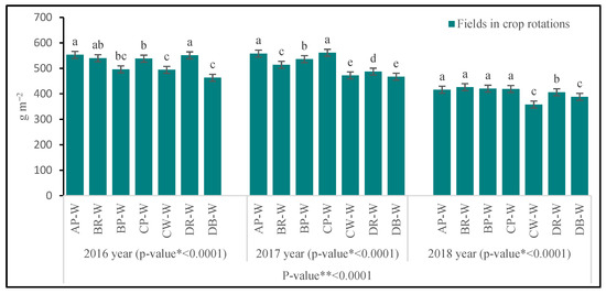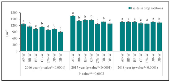Above-ground biomass of winter wheat at BBCH 36 stage. Abbreviations: * p-value for fields in crop rotations, ** p-value for years; AP-W—crop rotation A, forecrop pea; BR-W—crop rotation B, forecrop rape; BP-W—crop rotation B, forecrop pea; CP-W—crop rotation C, forecrop pea; CW-W—crop rotation C, forecrop wheat; DR-W– crop rotation D, forecrop rape; DB-W—crop rotation D, forecrop barley. Different letters indicate significant differences between fields in crop rotation (p < 0.05); n = 4.