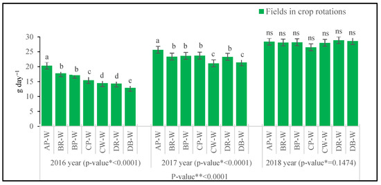 Crop (wheat) growth rate (CGR) between BBCH 36 and BBCH 58 (g·m−2·day−1). Abbreviations: * p-value for fields in crop rotations, ** p-value for years; AP-W—crop rotation A, forecrop pea; BR-W—crop rotation B, forecrop rape; BP-W—crop rotation B, forecrop pea; CP-W—crop rotation C, forecrop pea; CW-W—crop rotation C, forecrop wheat; DR-W– crop rotation D, forecrop rape; DB-W—crop rotation D, forecrop barley. Different letters indicate significant differences between fields in crop rotation; ns – non significant (p < 0.05); n = 4.